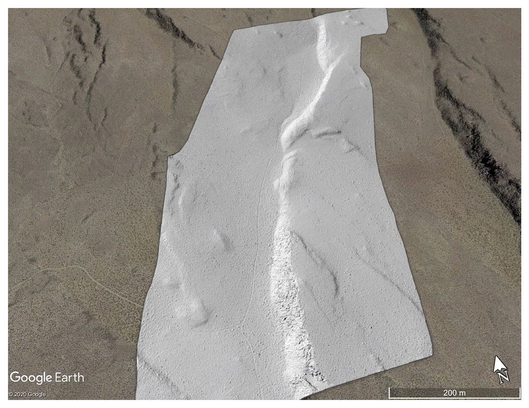 Digital Surface Model (DSM) hillshade along the fault and draped on Google Earth Imagery.