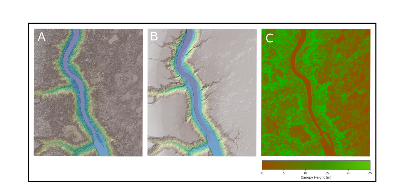 A three panel figure of a section of the Athabasca River in Alberta. Figure A is the Digital Surface Model which includes buildings, trees and other structures. Figure B is the Digital Terrain Model and is a bare-earth representation of the topography. Figure C is the Canopy Height Model (CHM) which is the difference between the DSM and the DTM. A CHM can be derived anywhere within the HRDEM since there is both DTM and DSM data available everywhere within the dataset.