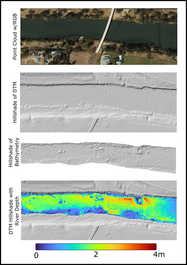 Multi-panel plot of a section of the Sacramento River. Top panel shows a point cloud colored by RGB values followed by hillshade plots of the ground and bathymetry data. Finally, the bathymetry was differenced from the water surface to produce a water depth map that is displayed in color draped on the DTM hillshade in the bottom panel.