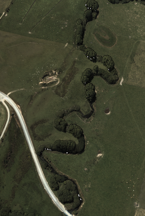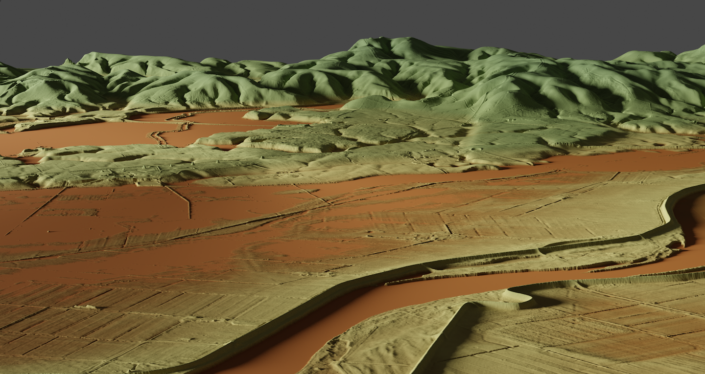 Oxbow lakes can be seen in this lidar point cloud colored by RGB values.