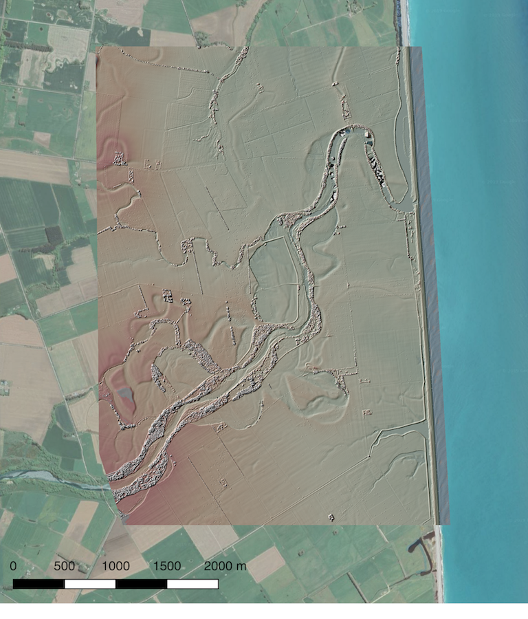 DSM hillshade of farmland near Willowbridge, New Zealand from the Canterbury, New Zealand 2016 dataset. DEM is draped on Google Earth imagery.
