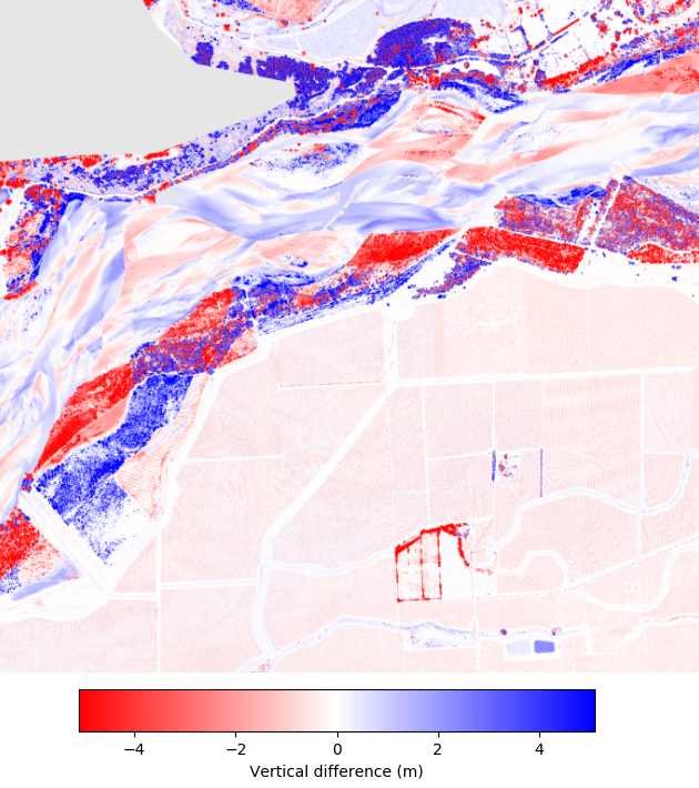 Map of elevation change between 2014 and 2020 over Marlborough, New Zealand from above pictures. This image was produced using OpenTopography's vertical differencing tool. This on-demand tool calculates the difference between DEMs generated from point clouds, and provides users with a quick and easy way of analyzing topographic change.
