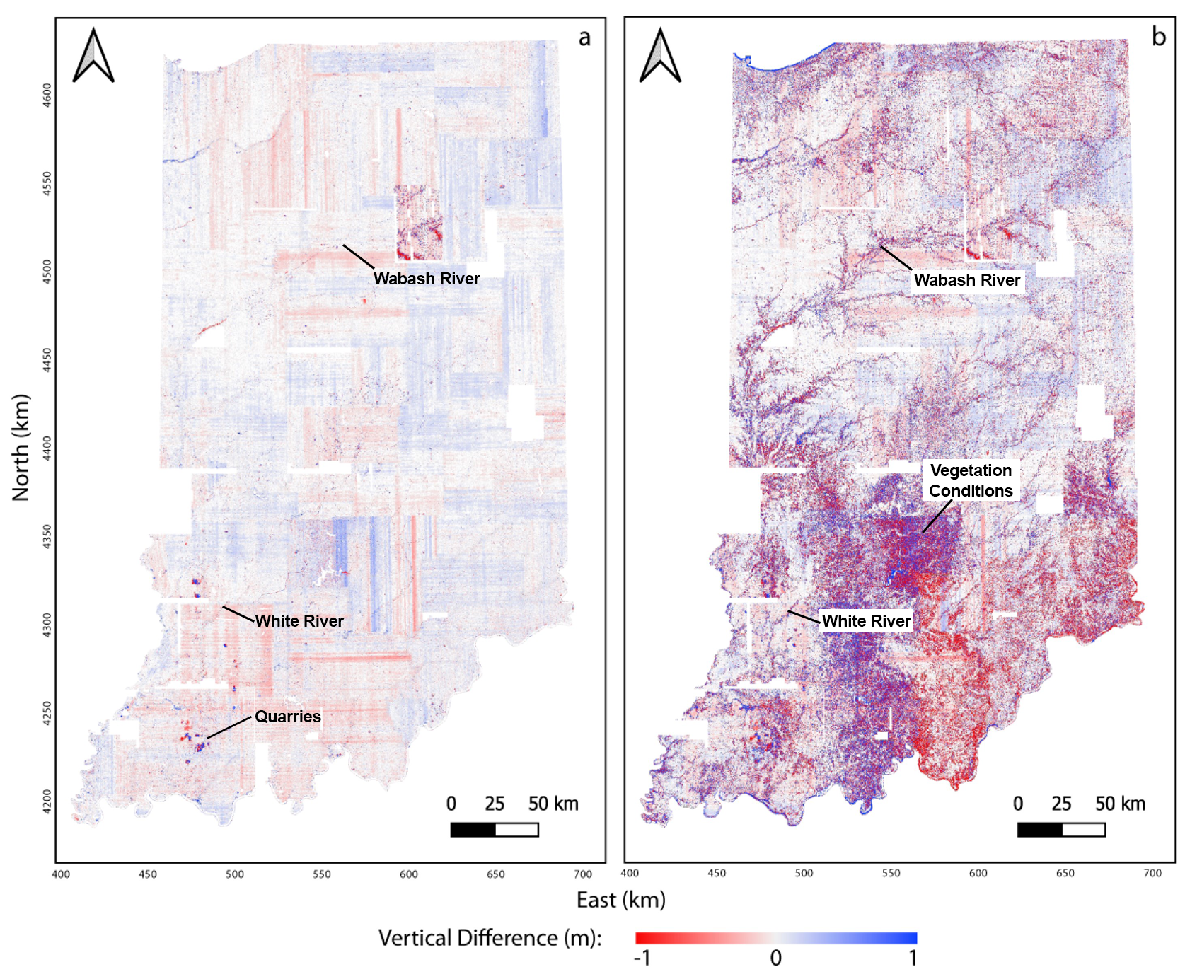 Indiana statewide topographic differencing with high resolution lidar topography collected in 2011–2013 and 2016–2020. (a) The differenced digital terrain model (DTM) and (b) the differenced digital surface model (DSM). Both the differenced DTM and DSM reflect physical changes due to mining and quarrying near the western and southern state borders. The Wabash River and the White River create change patterns stretching across the central and southern portions of the state produced by fluvial, riparian, and anthropogenic activity. Color variations in the south-central portion of the DSM change map reflect different seasons of lidar acquisitions and leaf-on and off conditions. The distinct north-south and east-west oriented lines primarily seen in the DTM do not represent change and are an error artifact from the lidar data.
