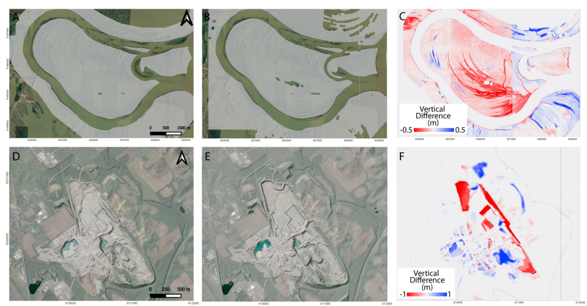 (A–C) Wabash River fluvial change along point bar scrolls in SW Indiana, (D–F) Sellersburg Stone Quarry excavation and piles near Louisville, IN, highlighted on the differenced digital terrain models.