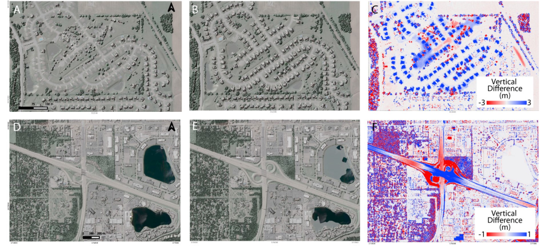 (A–C) A new housing development and (D–F) highway construction near Indianapolis, highlighted on the differenced digital surface models.
