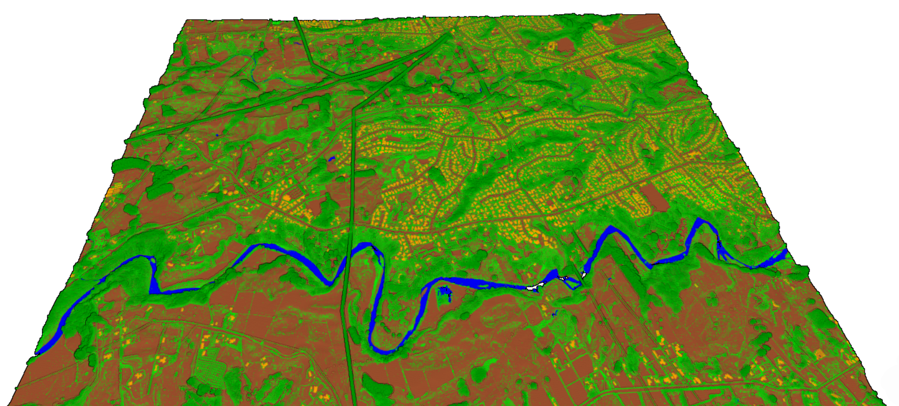 3D point cloud colored by return classification of the Highlands Park in the Taranaki region, NZ (Brown=ground, green=vegetation, orange=buildings, blue=water).