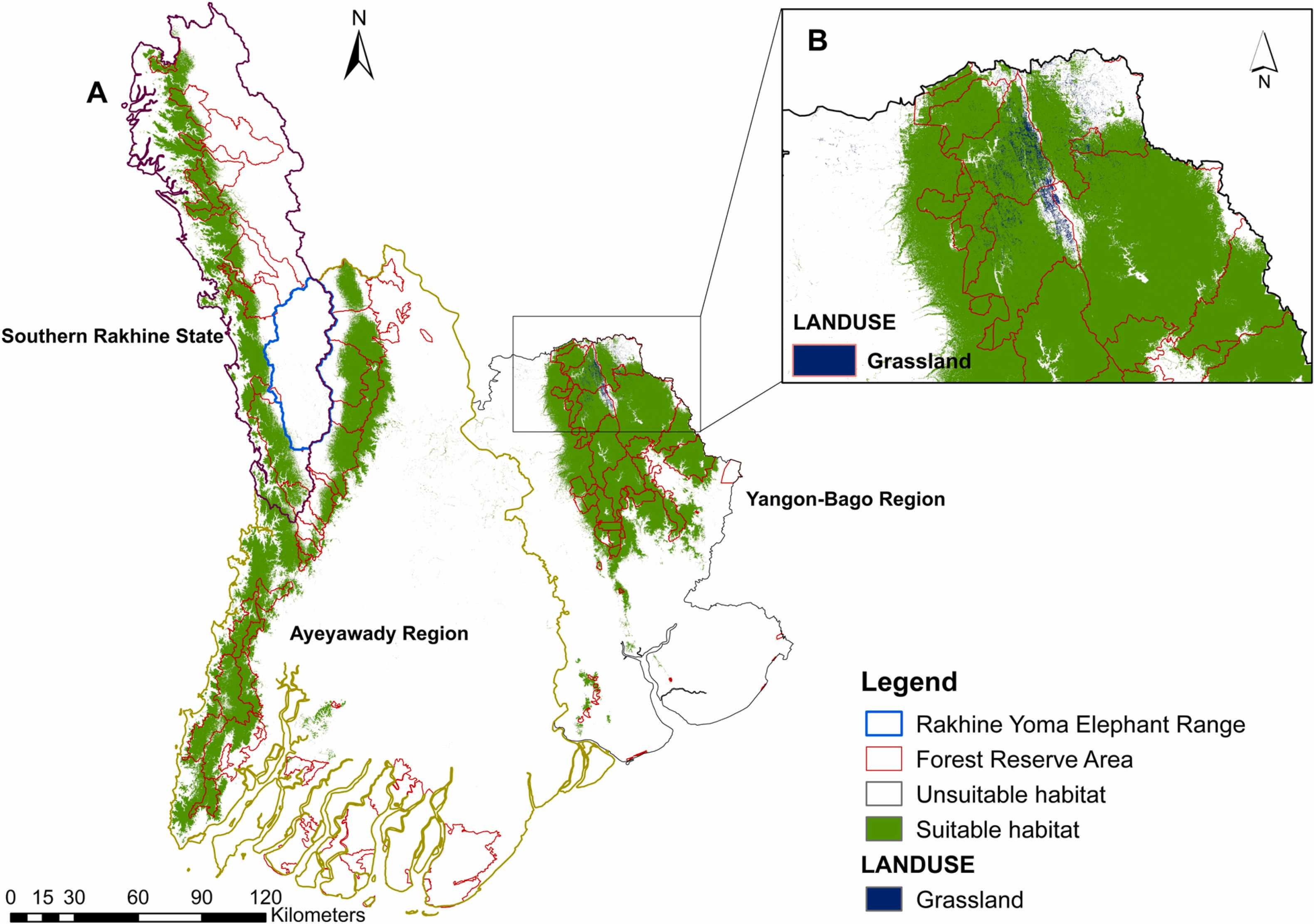 Habitat destruction and poaching threaten the distribution and population of wild Asian elephants. Habitat loss increases the number of incidents of conflict between people and elephants, often harming human lives and property and threatening elephant conservation. To better understand the association between wild Asian elephant habitat and human-elephant conflicts, Thant et al. identified the habitats that were used by wild Asian elephants in Myanmar. They tracked the movement of 25 elephants with GPS collars in southwestern Myanmar and evaluated their locations compared to different environmental variables including topography (e.g., elevation and the ruggedness of the terrain), climate, vegetation, and human footprint. They found that elephants preferred to live at lower elevations, with nearby water sources and adequate precipitation. Elephants highly used grasslands and degraded forests, which are not an optimal habitat due to their disturbance from and proximity to humans. The study concluded that human encroachment has intensified human-elephant conflict and that these areas should be monitored and forests restored to reduce conflict.