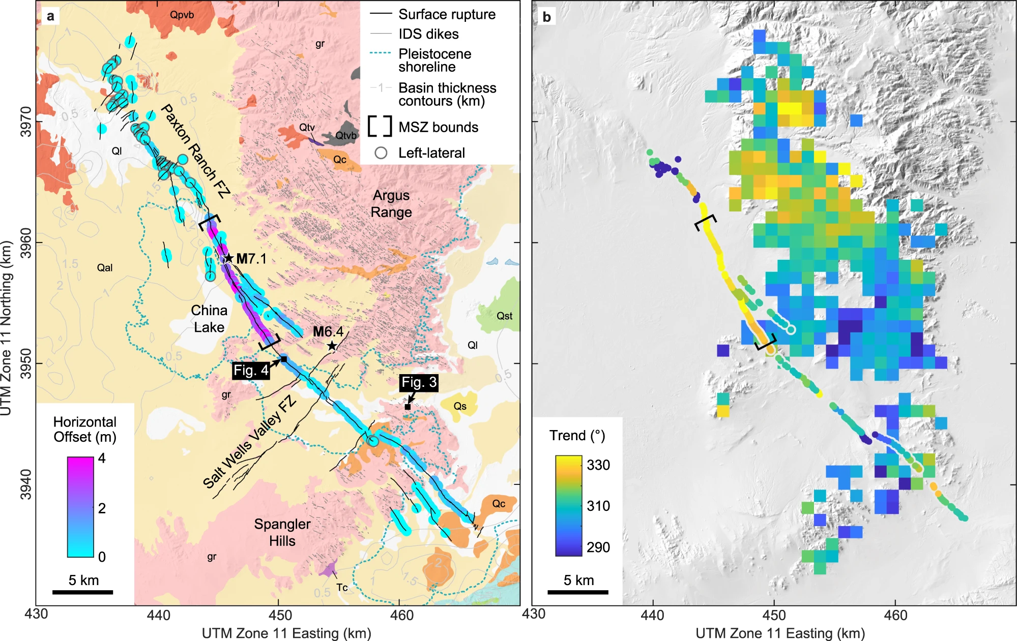 A comparison of the horizontal offset of the M7.1 Ridgecrest earthquake with geologic structures (left) and the trend (cardinal direction) of earthquake rupture and dikes (right). Figure from Nevitt et al. (2023).