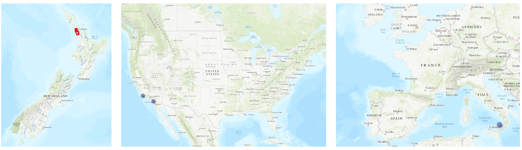 Left hand panel shows new Land Information New Zealand (LINZ) dataset coverage in red. Middle panel shows two new Community Dataspace datasets in purple in Southern California. Right hand panel shows the location of a new Community Dataspace dataset in purple over the Stromboli volcano in Southern Italy.