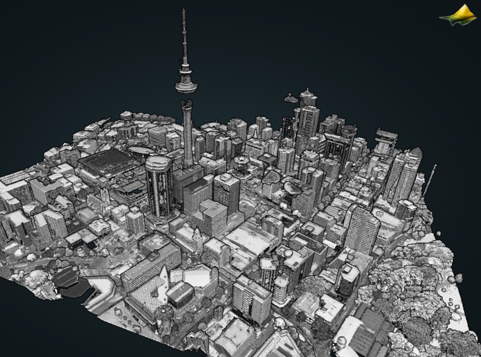 3D point cloud colored by intensity of downtown Auckland, New Zealand and the Auckland SkyTower. Data Source: OpenTopography: Auckland Part 1, New Zealand 2024.